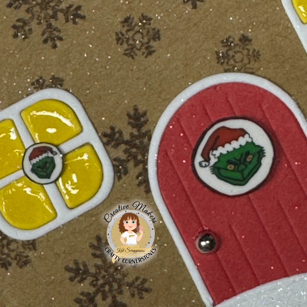 To decorate, I went through my stash and pulled out red, white, green, and yellow glitter cardstock scraps. I used these to die cut embellishments for the gingerbread house. From the Merry Grinchmas Embellishment Set, I added some playful Grinch-themed accents.
