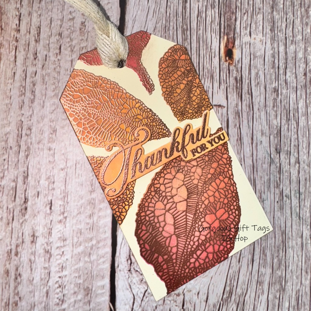 **After making this tag I realized the Look for them in the Leaves stamps are no longer available. I would suggest Gina K Designs Skeleton Leaves stamp set as a great alternative. This set has matching dies and poly-glaze if you prefer foiling to heat embossing.