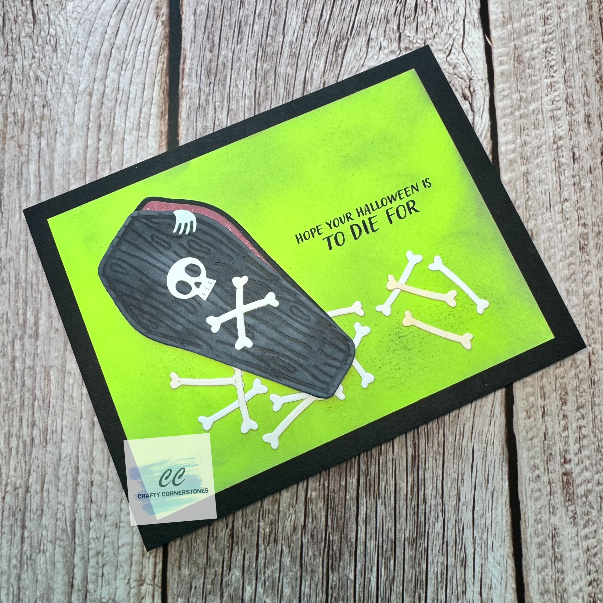 To finish, I stacked bones around the coffin and embossed a dark sentiment. It feels like the perfect wrap-up to this spooky journey.