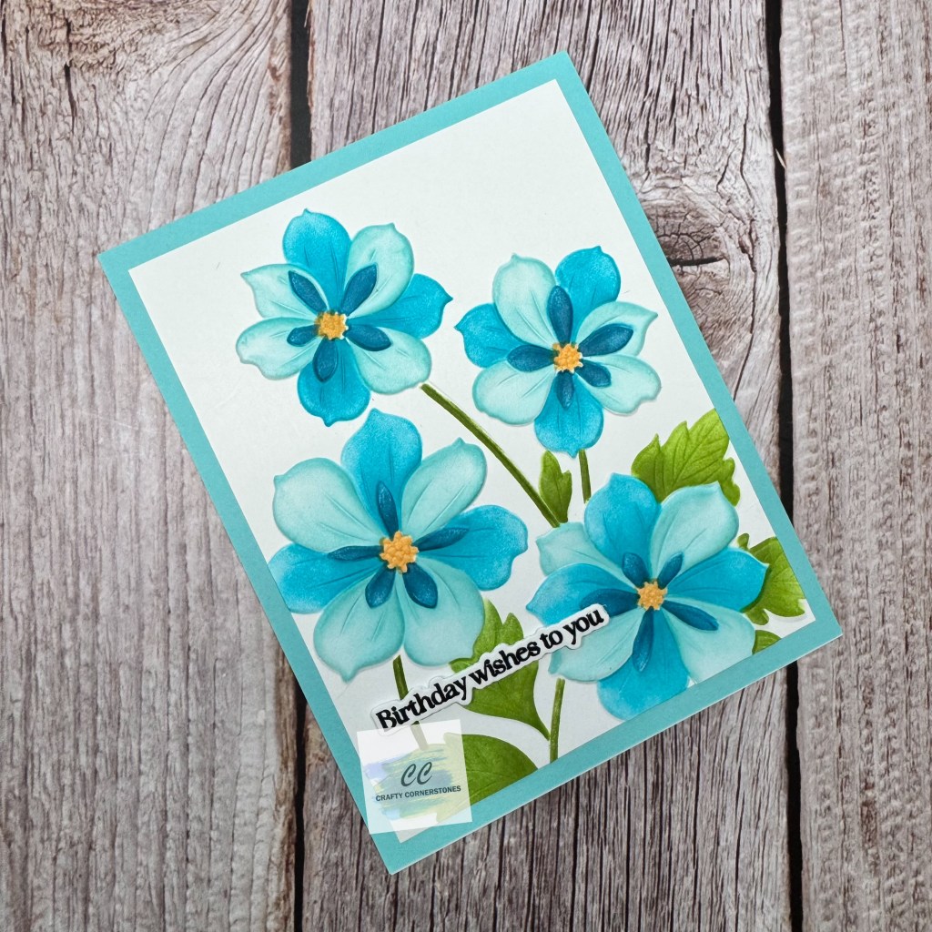 To complete the design, I added a Happy Birthday sentiment from the Gina K Sending Flowers Stamp and Dies Set, popped it up slightly with foam tape, then matted the finished panel with coordinating cardstock to match the blue floral tones.