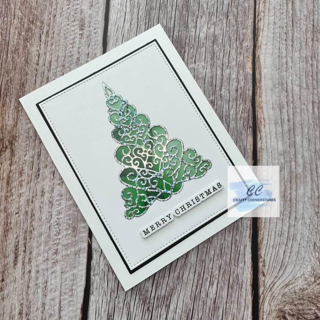 Before assembling, I tested a few background options for the inlaid tree. I tried black cardstock, then solid green, but neither gave the look I envisioned. Instead, I chose a green background using premade alcohol ink paper cut just slightly larger than the tree opening. That went behind the white panel and added the perfect holiday glow.
