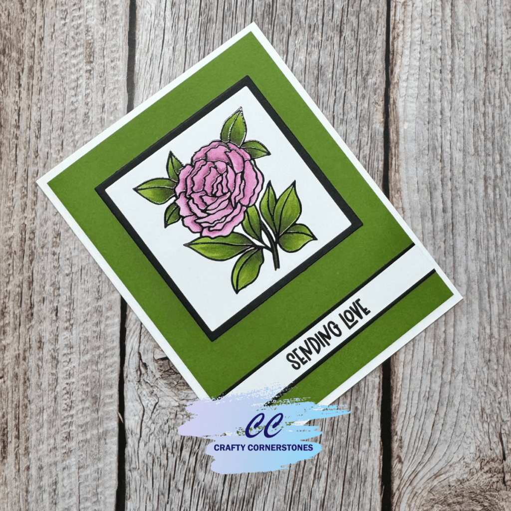 Today’s surprise from the Pink and Main Advent Calendar was a beautiful peony stamp paired with the sentiment Sending Love. I am absolutely loving all of these classic floral stamps. They are timeless, versatile, and perfect for a wide variety of card styles.